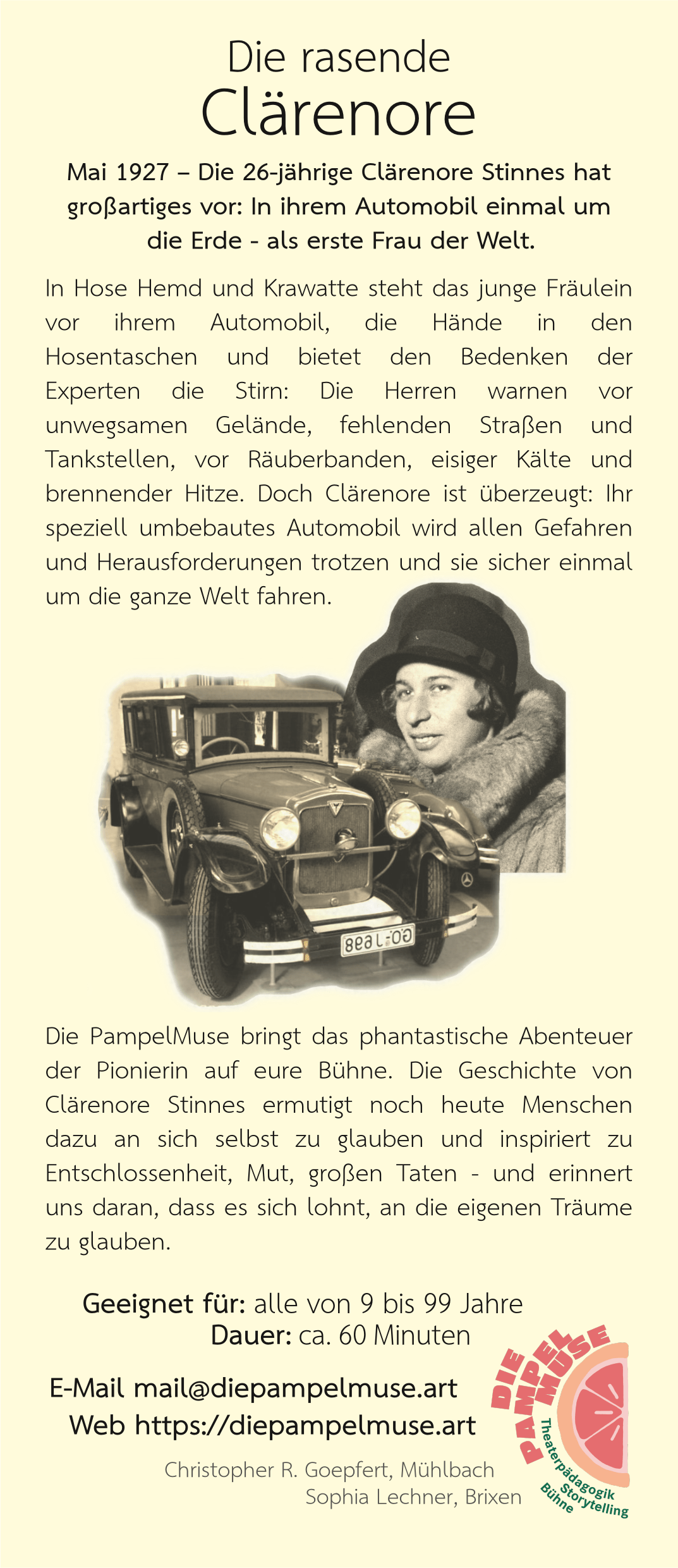 Die PampelMuse bringt das phantastische Abenteuer der Automobil-Pionierin Clärenore Stinnes auf eure Bühne. Ihre Geschichte ermutigt noch heute Menschen dazu an sich selbst zu glauben und inspiriert zu Entschlossenheit, Mut, großen Taten – und erinnert uns daran, dass es sich lohnt, an die eigenen Träume zu glauben.