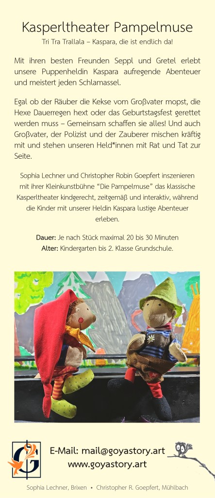 Sophia Lechner und Christopher Robin Goepfert inszenieren mit ihrer Kleinkunstbühne “Die Pampelmuse” das klassische Kasperltheater kindgerecht, zeitgemäß und interaktiv, während die Kinder mit unserer Heldin Kaspara lustige Abenteuer erleben.